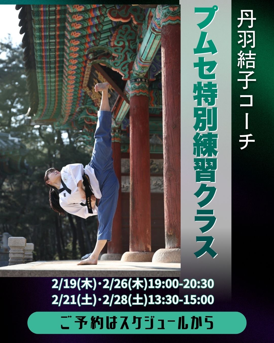 ★丹羽結子コーチ テコンドープムセ特別クラス(オープンクラス) 国内外で活躍するトップ選手・丹羽結子コーチが、韓国から一時帰国している期間、プムセ技術向上を目的とした特別クラスを開催いたします。 正確なフォーム、力強さ、 詳しくはこちら